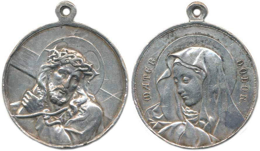 Pašijová medaile, A: Poprsí Ježíše Krista s trnovou korunou, nes oucí kříž / R: Hlava Panny Marie Bolestné podle obrazu Madonna de l Dito (Carlo Dolci 1616-1686) nové stříbro 40 mm ploché ouško