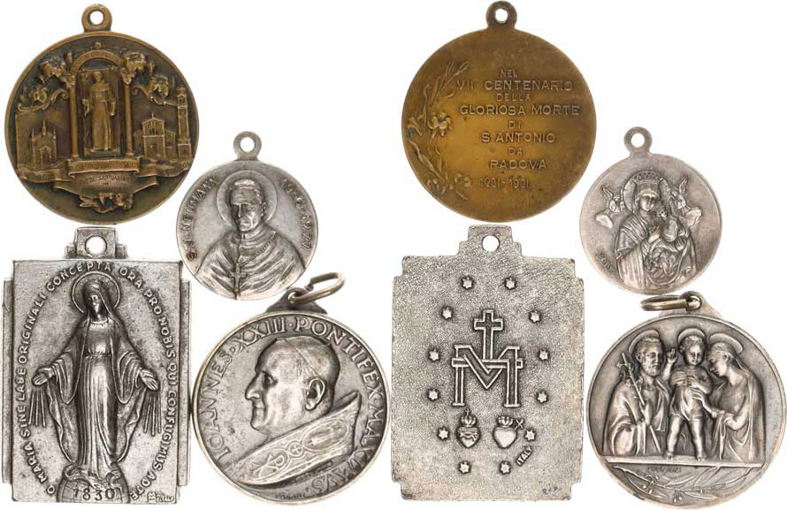 Konvolut 4 kusů: 1/ "Zázračná medaile" podle zjevení v r. 1830 25x32 mm; +2/ Jan XXIII., Pontifikální medaile, Svatá rodina sign.: MISTRVRZI PAGANI; +3/ Padova, medaile 1931 - 100 let od svatořečení Antonína Paduánského; +4/ Sv. Jan Nepomuk Neumann / PM Ustavičné pomoci