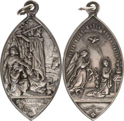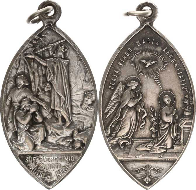 Medaile náboženského společenství. Svatý Ladislav otvírá pramen v e skále / Zvěstování Panně Marii sign. alpaka 26x45 mm závě s