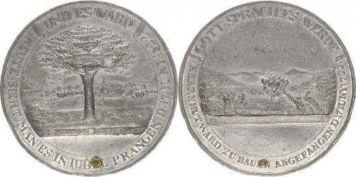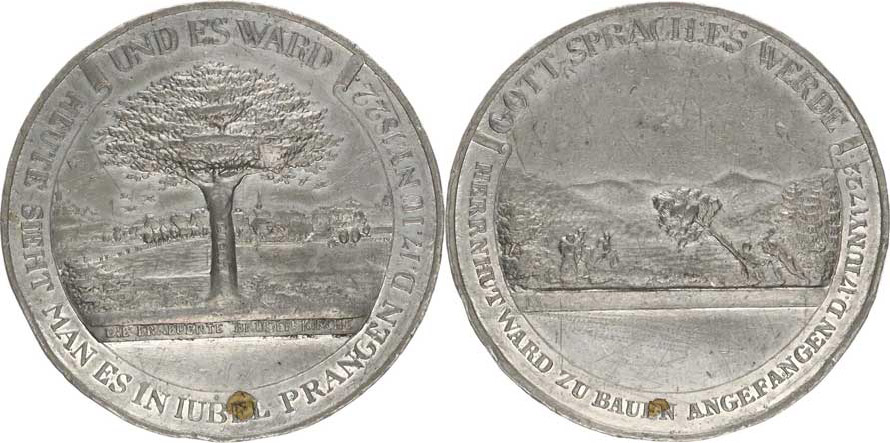 Medaile k založení komunity Moravských bratří 17.7. 1822 na panst ví hraběte Nukolause Ludwiga von Zinzendorf v saském Berthelsdorf u Sn 43 mm Cu čep pravosti_dr. hr.