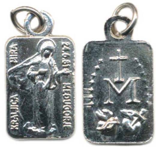 Medžugorje - Poutní medailka. Av.: Stojící Panna Maria, po stran ách opis s datem - 24.6. 81 / Monogram M, nad ním kříž, dole dvě srdce, kolem 14 hvězd bílý bronz 11x17 mm ouško