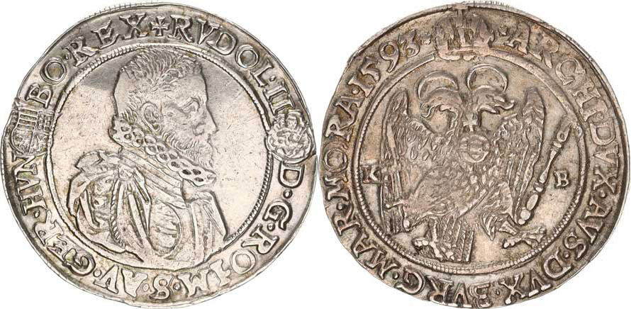 Tolar 1593 KB jako Husz. 1030, opis: BO. REX+ , bez tečky za HVN a II - svatozáře jsou pod korunou, nad hlavami orlů 28,084 g "R"