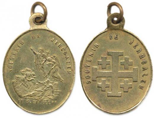 Israel, Jerusalem - Poutní medaika. Av.: Výjev zmrtvýchvstání / Jeruzalemskýkříž a opis SOUVENIR DE JERUSALEM mosaz 19x23 mm orig. ouško
