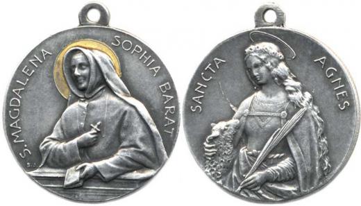 Sv. Magdalena Sophia Barat (1779-1865), zakladatelka kongregace N ejsvětějšího Srdce Ježíšova. Av.: Postava světce do pasu, opis / Svatá Amežka Římská, opis sign.: S.J. nové stříbro 26,5 mm orig. ouško