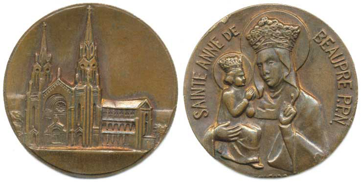 Kanada - Bazilika sv. Anny v Beaupre u řeky sv. Vavřince. Av.: Svatá Anna s Pannou Marii v náručí, opis / Chrám, bez textu Cu 30,5 mm
