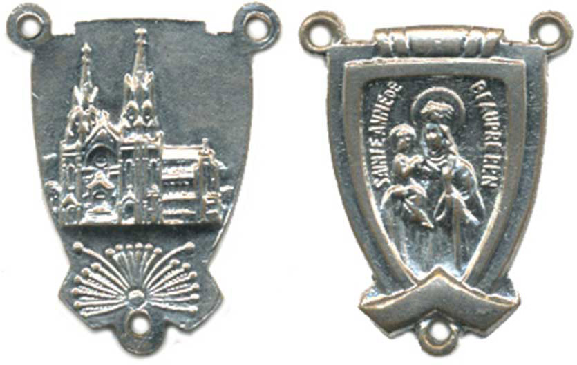 Kanada - Bazilika sv. Anny v Beaupre u řeky sv. Vavřince. Av.: Svatá Anna s Pannou Marii v náručí, opis / Chrám, bez textu růžencová medailka 17x22 mm ouško