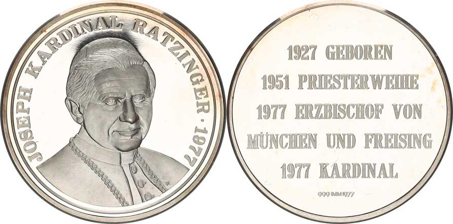 Německo - Joseph kardinal Ratzinger 1977, poprsí mírně zprava, op is / 5ti řádkový německý nápis Ag 999 34,867 g 40 mm