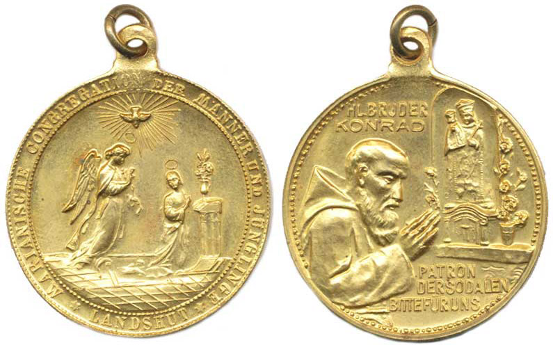 Landshut - Mariánská kongregace mužů a jinochů. Av.: Výjev Zvěst ování Panně Marii, opis / Svatý bratr Konrád v kapucínském habitu se modlí u sošky Panny Marie Altöttingské SODALEN / BITTE FÜR UNS bronz zlacený 33 mm závěsné ouško