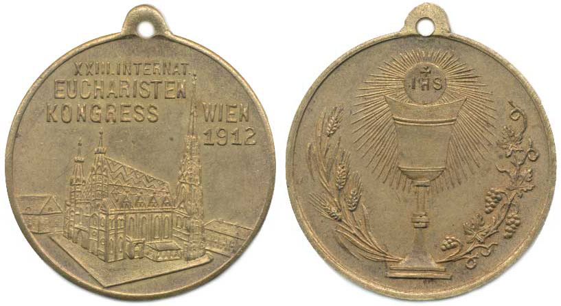 Rakousko - Vídeň, XXIII. Eucharistický kongres 1912, Chrám sv. Štěpána / Kalich s hostií - typ paprsková svatozář zlac. mosaz 33 mm původní ouško