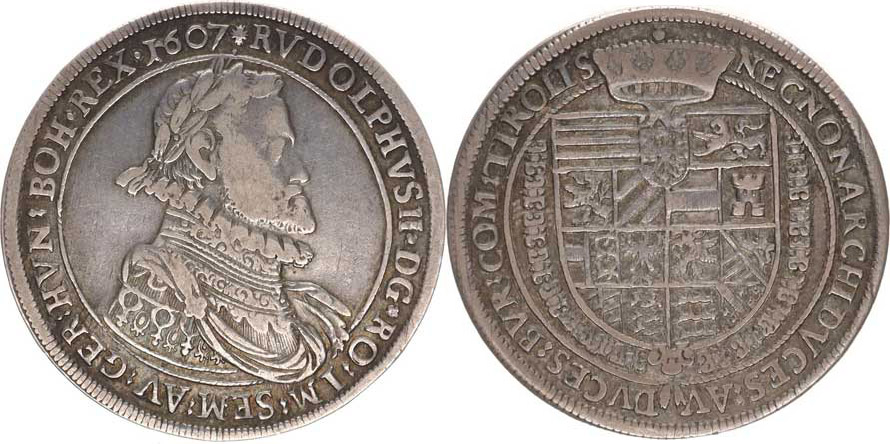 Tolar 1607, Tyroly, Hall jako Vogl. 96/ IX ale v Rv. prlov. k ruh, malá koruna, opis: COM: TIROLIS 28,182 g_tém.