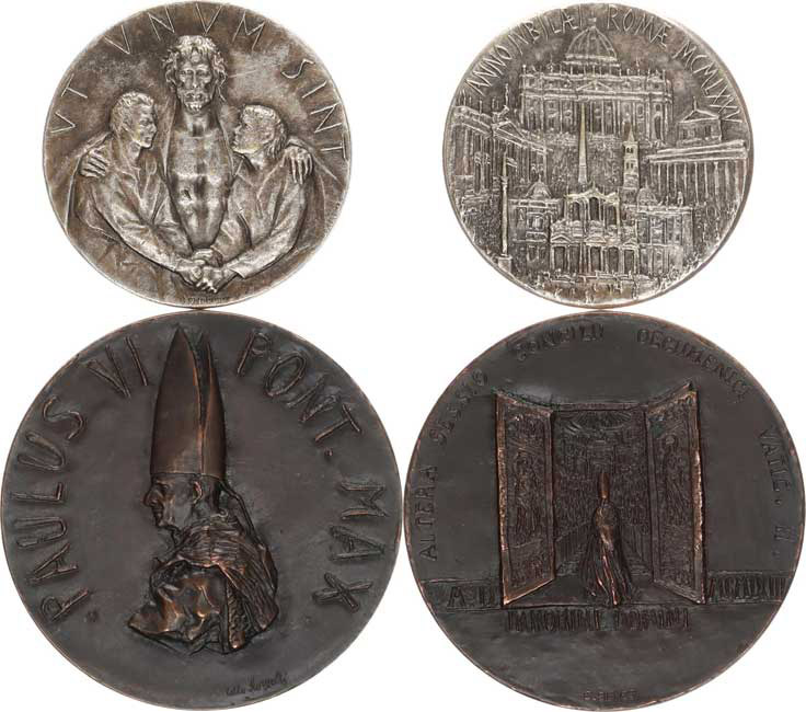 Vatikán - Paulus VI., 1/ Medaile na 2. vatikánský kongres 1963 sign.: E. SENESI bronz patin. 44 mm 2/ Medaile na svatý rok 1975 signováno bílý kov 34 mm 2 ks