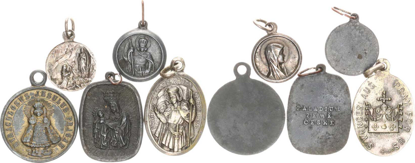 Konvolut 5 kusů různých svátostek z obecných kovů: 1/ Sv. Václav / král. koruna 16x23 mm; +2/ Sv. Václav 14 mm; +3/ St. Boles lav, Paladium země České 17x23 mm; 4/ Pažské Jezulátko 20 mm 5/ Lurdy, poutní medailka 13 mm 5 ks