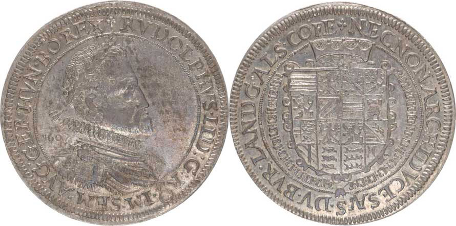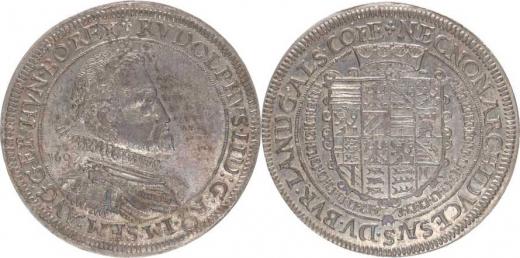 Tolar 1607, Alsasko, Ensisheim Voglhub. neuvádí: Av. jako 9 5/VI (datace nad ramenem) - Rv. jako 95/VII (koruna nepřeruuje op is) 28,45 g