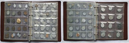Sbírka 55 kusů různých svátostek, 10 - 30 mm uloženo na třech lis tech v kroužkovém zásobníku