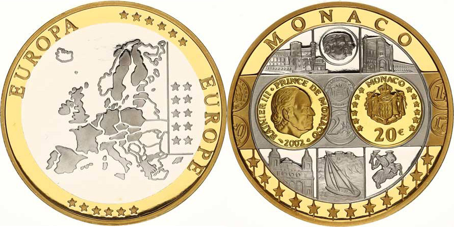 EUROPA, Mapa sjednocené Evropy / Monako bimetal 40 mm 20 g nepumcováno kapsle
