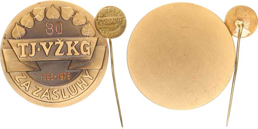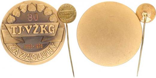 80 let TJ VŽKG 1985-1975, "ZA ZÁSLUHY" bronz 40 mm +klopový odznak orig etue