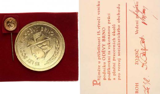 "15 let podniku Oděvy Brno", Hlava Merkura vlevo, opis zlacený kov 50 mm +klopová miniatura 13 mm v orig. balení s dek retem Za vykonanou práci..... 2 ks
