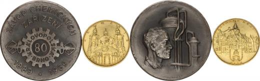Královopolská Brno "80" závod chemických zařízení 1889-1969, logo fy. a opisy / chemické zařízení a portrét pracovníka sign.: O. Martínek postř. bronz 50 mm 2/ Kroměříž, portál zámku / Zlínský kraj - Zlín zlac. kov 30 mm 2 ks