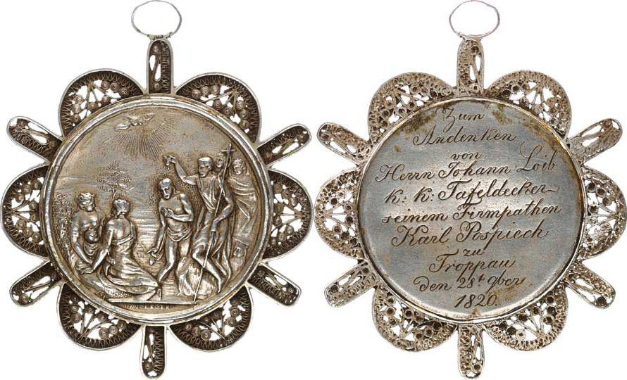 Kongres Svaté aliance r. 1820, Av.: Motiv biřmovací medaile, bisk up žehná biřmovancům před kostelem, nad nimi v září holubice. V ú seči sign.: Heuberger. / Rv.: Na vložené stříbrné destičce 11ti řádkové věnování Karlu Pospiechovi z Opavy Ag 46 mm, zasazená do mezikruží s filigránovým zdobením. ouško jako Grosz 1673