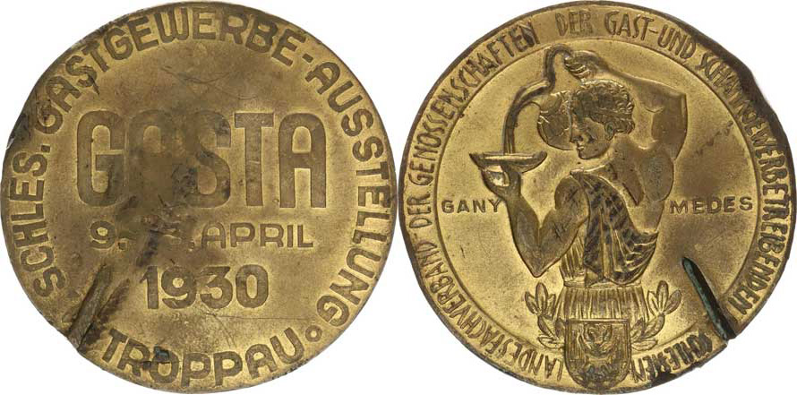 I. Slezská výstava v pohostinství GASTA 9.-13. 4.1930, Půlpostava číšníka olymp. bohů Ganymeda, opis / Nápis ve třech řádcích, opis zlacený bronz 52 mm Javor. III.25a_mírně otřelá, zásek