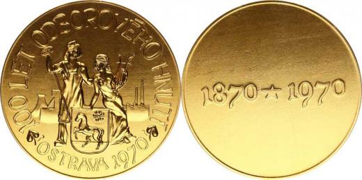 100 let odborového hnutí Ostrava 1970, městský znak a symboly měs ta / 1870 * 1970 datace orig etue s nápisem: Za dlouholetou a o bětavou práci v ROH pozlac. hliník 70 mm