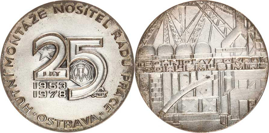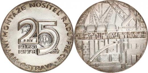 25 let Hutní montáže nositel Řádu práce 1953-1978, Datace a opis / Vysoké pece, nápis: Technický pokrok - Socialismus mír bronz postříbřený 50 mm orig. etue