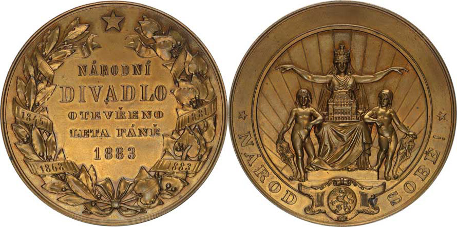 NÁROD SOBĚ, Bohemia s maketou ND na klíně / pětiřádkový nápis ve věnci: NÁRODNÍ DIVADLO OTEVŘENO LETA PÁNĚ 1883 nesignováno zlac. bronz 60 mm Don. 5012