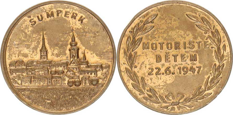 Motoristé dětem 27.6.1948, tří řádk.nápis v otevřené věnci / pohl ed na město Cu 30 mm_lak.