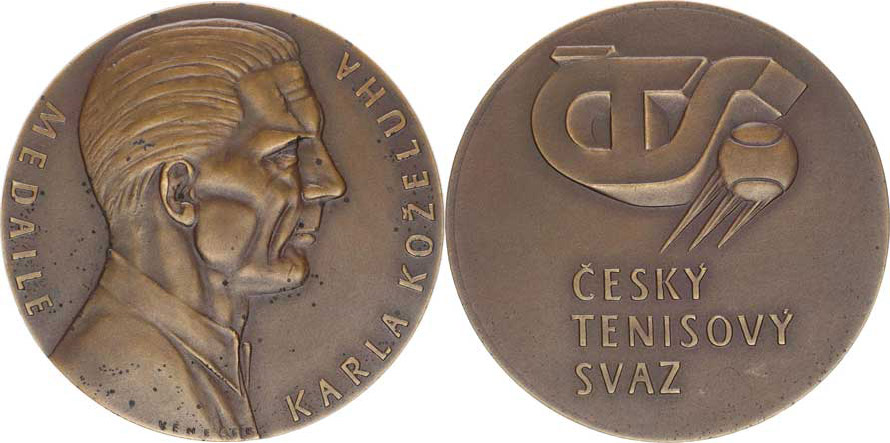 Medaile Karla Koželuha, Portrét zprava / Český tenisový svaz, zkratka ČTS a míček "R" bronz 60 mm orig. etue _dr. ox. ďubky
