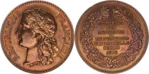Paříž - "Administ. des Monnaies-Exposition Universelle 1878", 7mi řádk. nápis v otevřeném věnci / Hlava Republiky, opis sign.: BA RRE (medaile ražená v expozici mincovny na Světové výstavě) Cu 30,5 mm 12 g