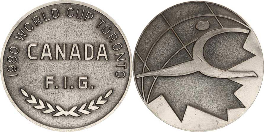 Toronto - World Cup 1980 F. I. G. (Mezinárodní gymnastická federa ce), Dvouřdk. nápis, opis / Styliz. gymnastka bílý kov 50 mm orig. etue