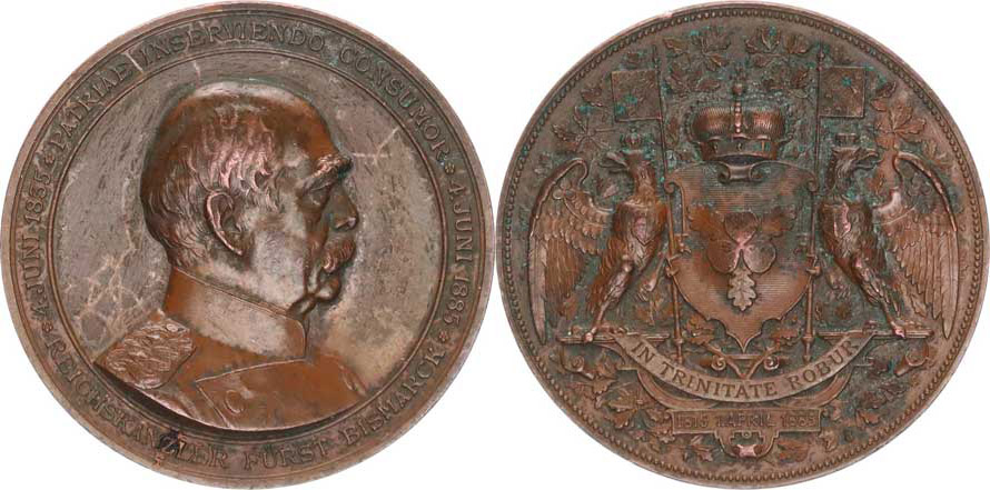 Bismarck, první říšský kancléř, V pruské maršálské uniformě zprav a, opis / K 70. výročí narození a 50 let ve státních službách, er b a opis sign.: K.SCHWENZER Cu 38 mm_dr. měděnka