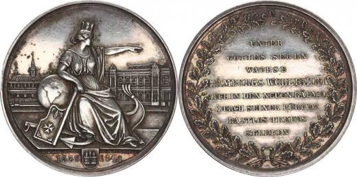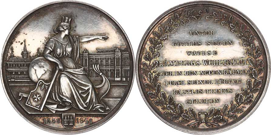 Hamburg - "Naděje na lepší časy", A: Žena sedící na přídí lodi s hradební korunou na hlavě, opírá se o globus, u nohou kotva a pra por, rukou ukazuje směrem k městu, v úseči městský znak rozděluje dataci 1558 - 1841 / / R: V dubovém věnci osmiřádkový nápis sign.: G. LOOS D. - H. LORENZ Ag 42,5 mm 28,915 g