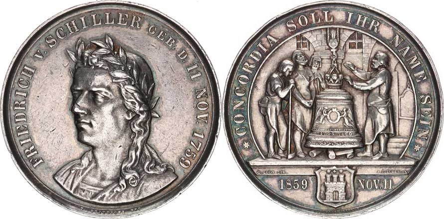 Hamburg - Fridrich v. Schiller Geb. 11 Nov. 1759, busta s vavříno vým věncem na hlavě zleva, opis / Zavěšení zvonu Concordia 11.11. 1859 sign.: G. LOOS. DIR. - A.FISHER INV. Ag 41,5 mm 28,976 g