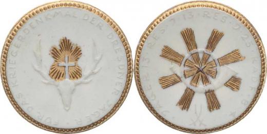 DRESDEN - "Für das Kriegerdenkmal der Dresdner Jäger" "R" míšeňský bílý porcelán 42 mm, se zlacenými paprsky a hranou
