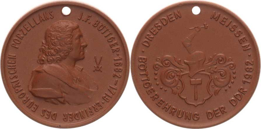 J.F. Böttger 1682-1719, vynálezce evropského porcelánu, poprsí zp rava, opis / Dresden-Meissen 1982, erb a opis míšeňský hnědý p orcelán 42,8 mm dírka pro závěs