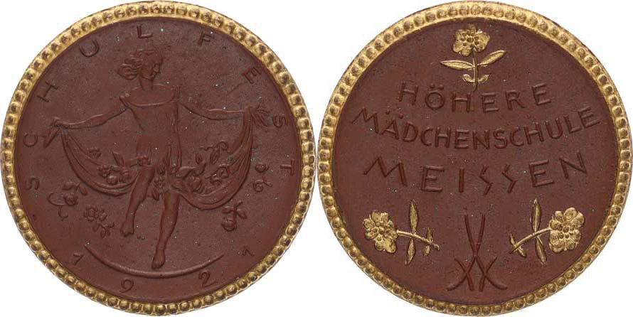 MEISSEN - Höhere Mädchenschule, třířádkový nápis / tančící dívka , opis SCHULFEST 1921 míšeňský hnědý porcelán se zlaceným okra jem a květy 37 mm