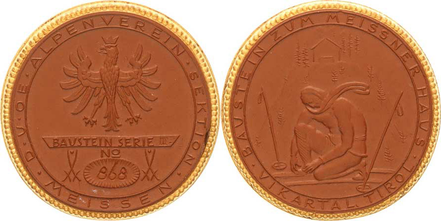 D.u.Oe Alpenverein Sektion, Baustein serie III. No. 868, Tyrolská orlice / Baustein zum Meissner Haus - Vikartal, Tirol, lyžař míšňský hnědý porcelán se zlacenou hranou 50 mm Schub. 82 "R"