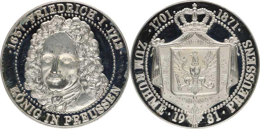 Friedrich I. König in Preussen 1657-1713, Portrét v paruce čelně, opis / Korunovaná pruská orlice, opis: ZUM RUHME PREUSSENS 1701-1 871-1981 Ag 999 50 mm 33,61 g
