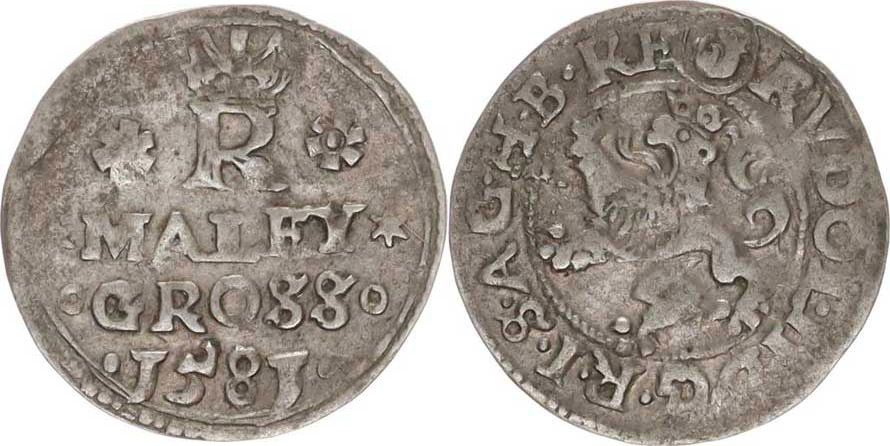 Malý groš 1581, Jáchymov-Kádner HN 3/7b - zajímavě ražená 5 v dataci, před a za MALEX *, před a za GROSS kroužky
