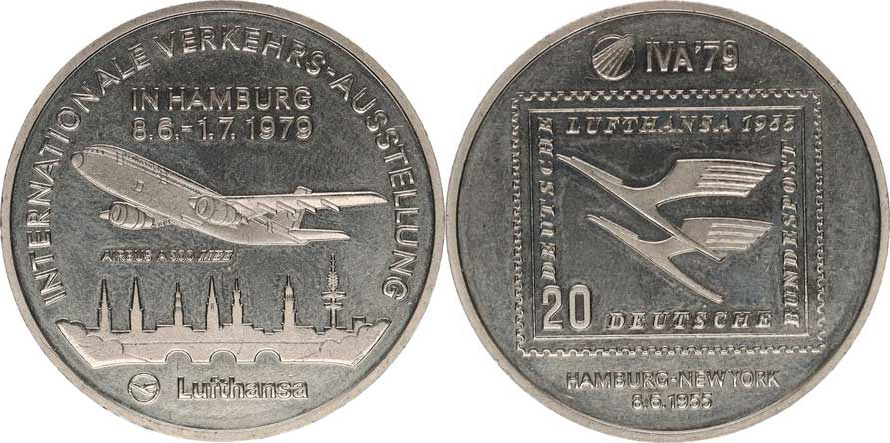 Hamburg, Mezinárodní výstava dopravy 8.6.-1.7. 1979, Airbus A 300 nad městem / IVA 79 Hamburg-New York 8.6. 1955, poštovní známka CuNi 39 mm N 48938