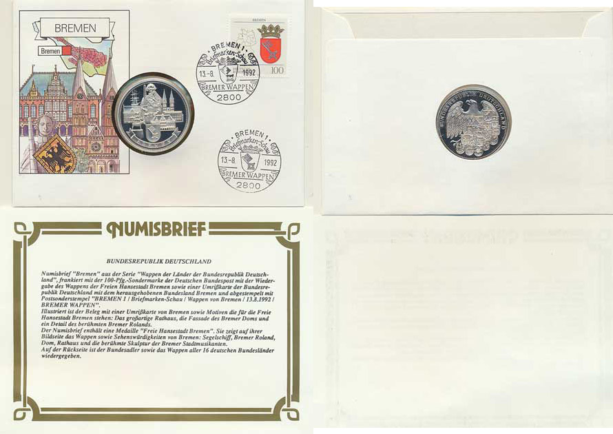 Série erby německých zemí: BREMEN, dominanty města, Ag medaile 41 mm, +známka 100 Pfg., +dvě razítka prvního vydá ní 13.8.1992, +Numisbrief (medaile PROOF)