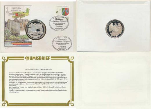 Série erby německých zemí: NORDHEIN-WESTFALEN Düsseldorf Ag medaile 41 mm, +známka 100 Pfg., +dvě razítka prvního vydá ní 12.8.1993, +Numisbrief (medaile PROOF)