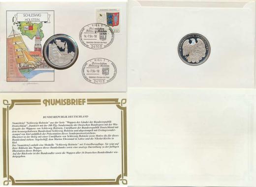 Série erby německých zemí: SCHLESWIG-HOLSTEIN Kiel Ag medaile 41 mm, +známka 100 Pfg., +dvě razítka prvního vydá ní 14.7.1994, +Numisbrief (medaile PROOF)