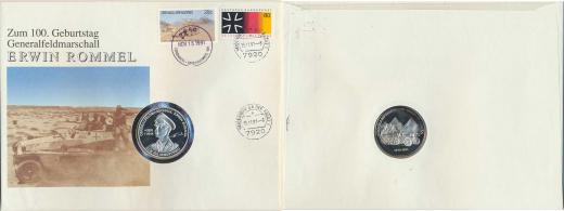 100. výročí narození Generalfeldmarschall Erwin Rommel 1891-1944, poprsí v uniformě / Romelův velitelský vůz "Greif v Africe Ag 4 0 mm (Proof), +dvě známky 80 Pfg. a 20 Cent Grenada, +tři razítka prvního dne 15.11.1991, +Numisbrief velký formát