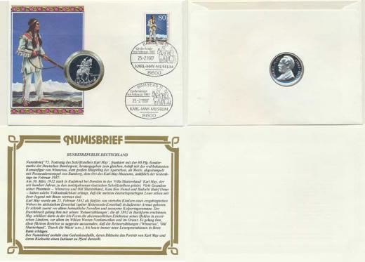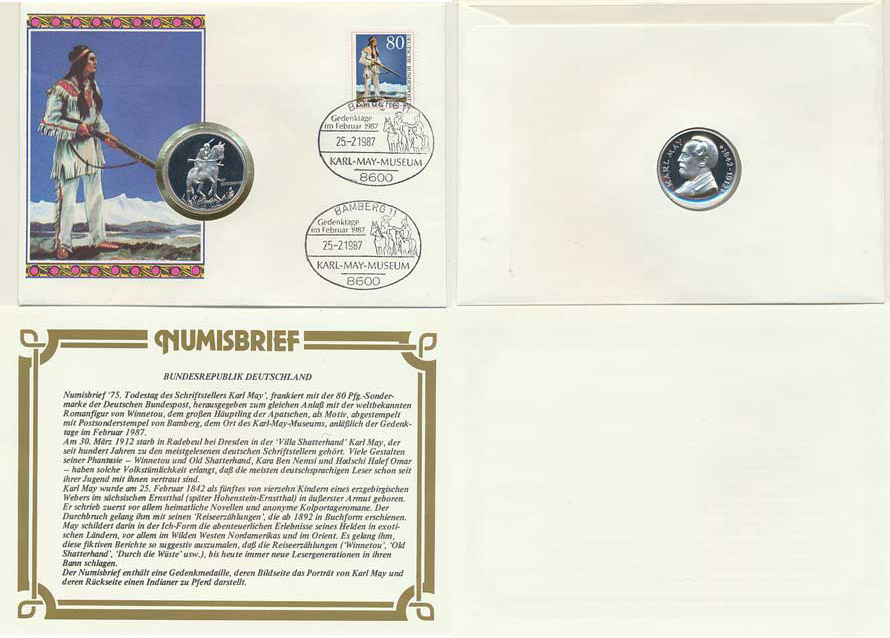 75. výročí úmrtí Karla Maye 1842-1912, hlava čelně / text Ag 999 ,9/1000 34 mm (Proof), +čryři známky 80 Pfg., +dvě razítka prvn ího dne 12.2. 1987