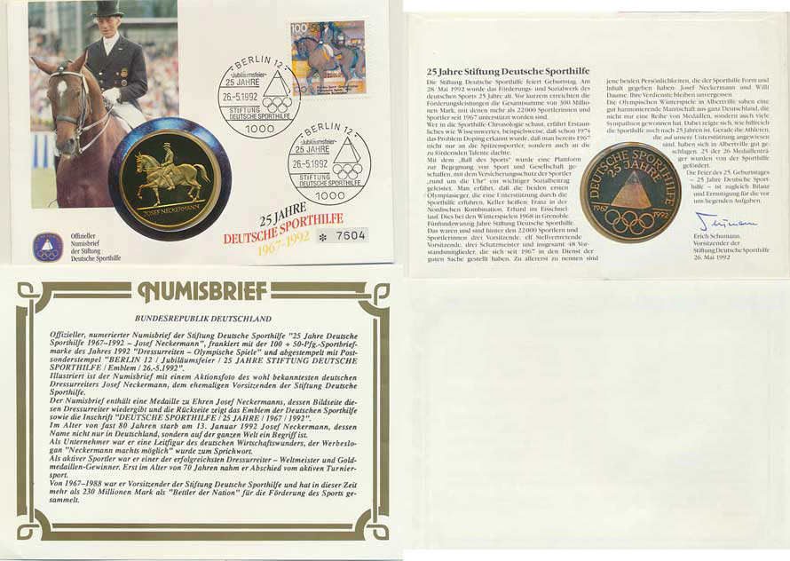 25 Jahre Deutsche Sporthilfe 1967-1992, Josef Neckermann na koni / olympijské kruhy a pyramida nikl 42 mm (Proof), +známka 100 Pf g. +dvě razítka prvního dne 26.5. 1992 číslo obálky *7604, +Numisbrief