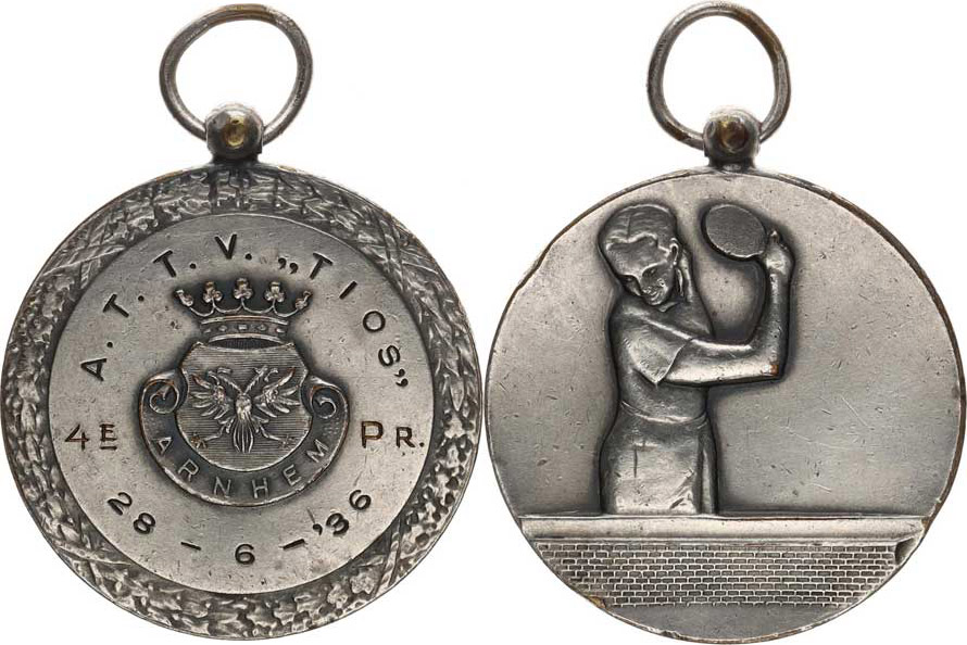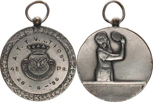 Arnhem - Sportovní cena A. T. V. "TIOS" 28.6. 1936 / Stolní tenis ta při hře, bez opisu bílý kov 40 mm pův. ouško +závěs