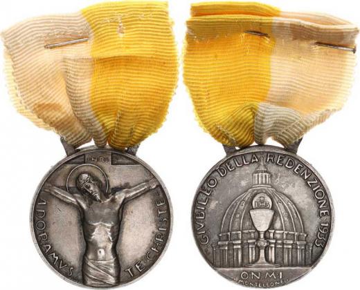 Pius XI., Medaile na jubil. Svatý rok 1933, Ježíš na kříži / Kopu le sv. Petra, vpopředí kalich s hostii, O.N.M.I sign.: MONTELEON E alpaka 30 mm +žluto-bílá stuha