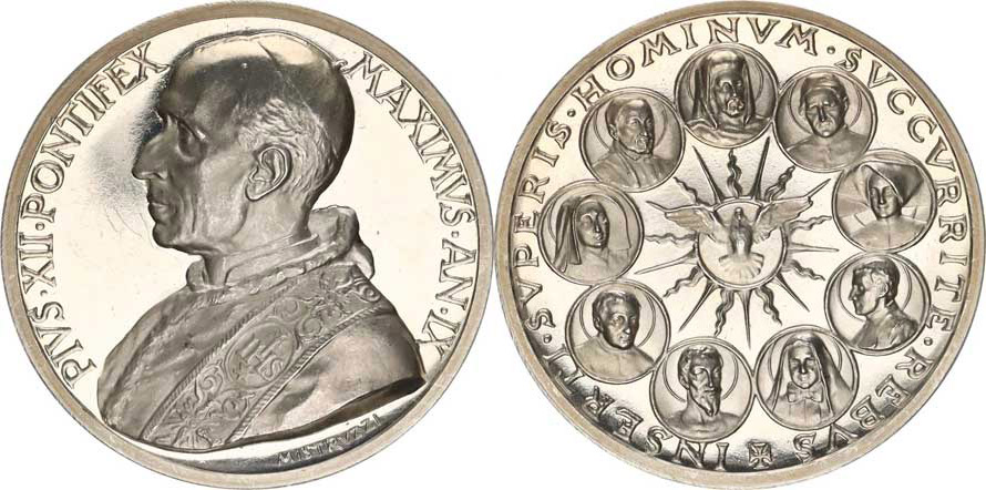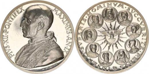 Pius XII., poprsí zleva, IX. rok pontifikátu (1947) / Devět novýc h světců sign.: Mistruzzi Ag 44 mm 35,598 g